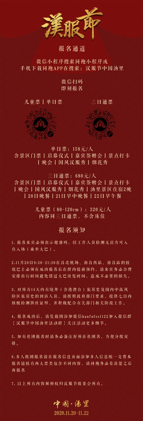 活动报名费用为650元/位,来宾可以选择乘坐接驳大巴或者自驾前往汤里。巴士将于11月20日早上9:30-晚上9:30,在南昌站、南昌西站、昌北机场三个站点免费接驳,必须在成功报名后提前预约,请来宾务必合理安排出行时间避免错过大巴出发时间,造成不必要的损失。报名来宾必须出示健康码,经工作人员检测无误方可入住入场(乘坐大巴)。报名成功后,请凭截图加入【汉服节中国汤里活动群】关注活动更多细节。
